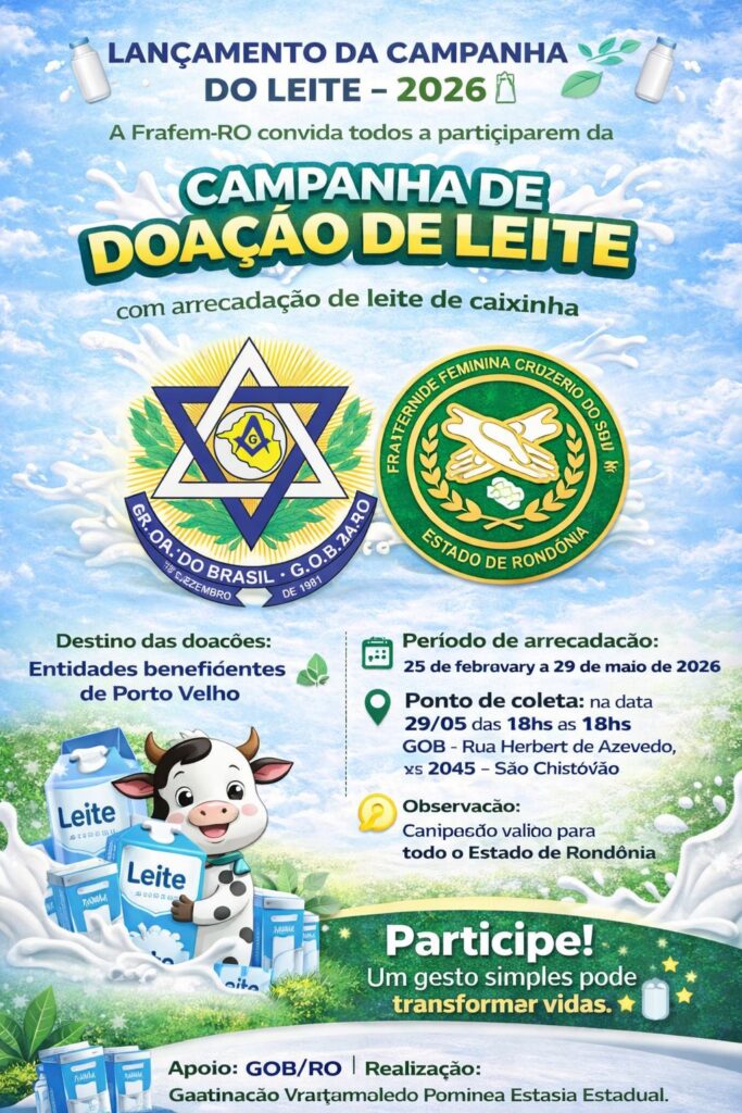 Fraternidade Feminina Cruzeiro do Sul – Rondônia (FRAFREM-RO), vinculada ao Grande Oriente do Brasil – Rondônia (GOB-RO), lançou oficialmente nesta terça-feira (25/02) a Campanha do Leite 2026, uma das principais ações filantrópicas da entidade no Estado.