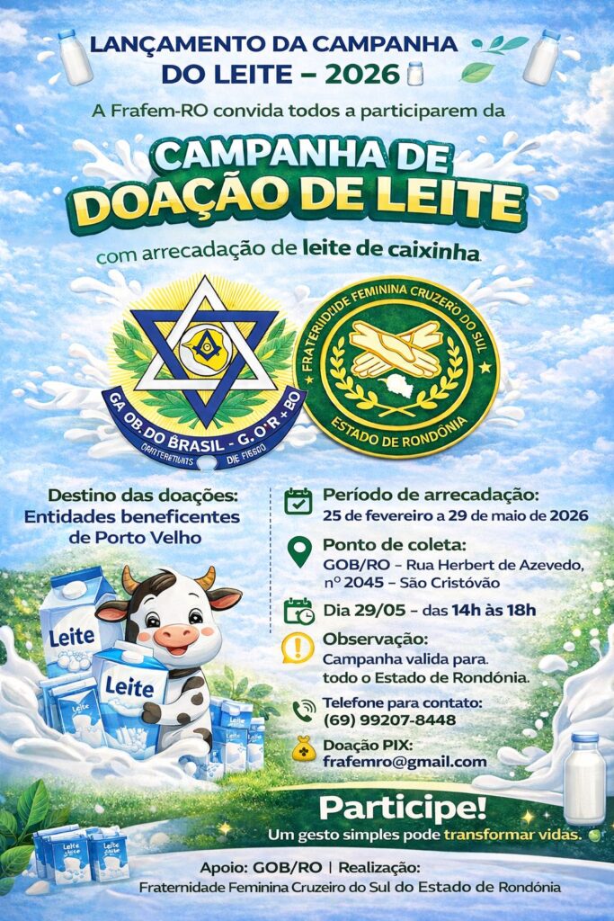 Fraternidade Feminina Cruzeiro do Sul – Rondônia (FRAFREM-RO), vinculada ao Grande Oriente do Brasil – Rondônia (GOB-RO), lançou oficialmente nesta terça-feira (25/02) a Campanha do Leite 2026, uma das principais ações filantrópicas da entidade no Estado.