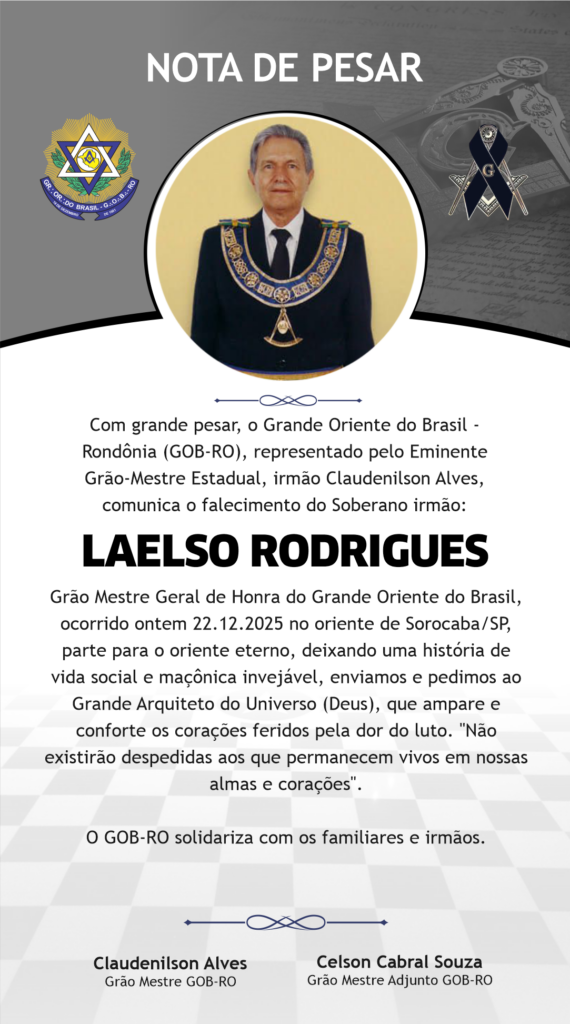 O Soberano Grão-Mestre Geral do GOB, Soberano Irmão Ademir Cândido da Silva, em nome da Instituição, rende homenagens ao Sapientíssimo Irmão Laelso Rodrigues, agradece por sua vida dedicada à Ordem e apresenta condolências à família, aos Irmãos da ARLS Perseverança nº 199 e a toda a comunidade maçônica.